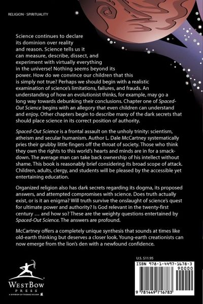 Science continues to declare its dominion over reality and reason. Science tells us it can measure, describe, dissect, and experiment with virtually everything in the universe! Nothing seems beyond its power. How do we convince our children that this is simply not true? Perhaps we should begin with a realistic examination of science's limitations, failures, and frauds. An understanding of how an evolutionist thinks, for example, may go a long way towards debunking their conclusions. Chapter one of Spaced-Out Science begins with an allegory that even children can understand and enjoy. Other chapters begin to describe many of the dark secrets that should place science in its correct position of authority. Spaced-Out Science is a frontal assault on the unholy trinity: scientism, atheism and secular humanism. Author L. Dale McCartney systematically pries their grubby little fingers off the throat of society. Those who think they own the rights to this world's hearts and minds are in for a smack-down. The average man can take back ownership of his intellect without shame. This book is reasonably brief considering its broad scope of attack. Children, adults, clergy, and students will be pleased by the accessible yet entertaining education. Organized religion also has dark secrets regarding its dogma, its proposed answers, and attempted compromises with science. Does truth actually exist, or is it an enigma? Will truth survive the onslaught of science's quest for ultimate power and authority? Is God relevant in the twenty-first century ... and how so? These are the weighty questions entertained by Spaced-Out Science. The answers are profound. McCartney offers a completely unique synthesis that sounds at times like old-earth thinking but deserves a closer look. Young-earth creationists can now emerge from the lion's den with a newfound confidence.