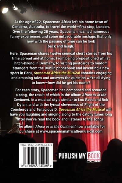 At the age of 22, Spaceman Africa left his home town of Canberra, Australia, to travel the world - first stop, London. Over the following 20 years, Spaceman has had numerous funny experiences and some unfavourable mishaps that only now with the passing of time can he look back and laugh. Here, Spaceman shares twelve comical short stories from his time abroad and at home. From being propositioned whilst hitch-hiking in Germany, to writing postcards to random strangers from the Dublin phonebook and inventing a new sport in Peru, Spaceman Africa the Musical contains engaging and amusing tales and answers the question we're all dying to know - how did he get his name? For each story, Spaceman has composed and recorded a song, the result of which is the album Africa as in the Continent. In a musical style similar to Lou Reed and Bob Dylan, and with the lyrical cleverness of Flight of the Conchords and Tenacious D, Spaceman Africa the Musical will have you laughing and singing along to the catchy tunes long after you've read the book and listened to the songs. The album Africa as in the Continent now available for purchase at www.spacemanafricathemusical.com
