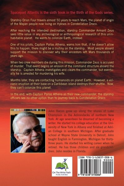 Spaceport Atlantis is the Sixth book in the Birth of the Gods Series. Starship Orion Four travels almost 50 years to reach Mars, the planet of origin of the Mayan people now living on Hyksos in Constellation Draco. After reaching the intended destination, starship Commander Armant Zeus sees little value in any archeological or anthropological research of this uninhabitable planet. He wants to colonize Earth, instead. One of his pilots, Captain Pallas Athena, warns him that, if he doesn't allow this to happen, there might be a mutiny on the starship. Most people aboard support the mission to discover why their ancestors left Mars thousands of years ago. When two crew members die during this mission, Commander Zeus is accused of murder. That event begins an erosion of the command structure aboard the starship. Captain Athena investigates and clears the commander, but eventually he is arrested for murdering his wife. Months later, they are contacting humanoids on planet Earth. However, a volcanic eruption at their base on a Caribbean island destroys their shuttle. Now, they can't colonize this planet. In the end, with Captain Pallas Athena as their new commander, the starship officers see no other option than to journey back to Constellation Draco.