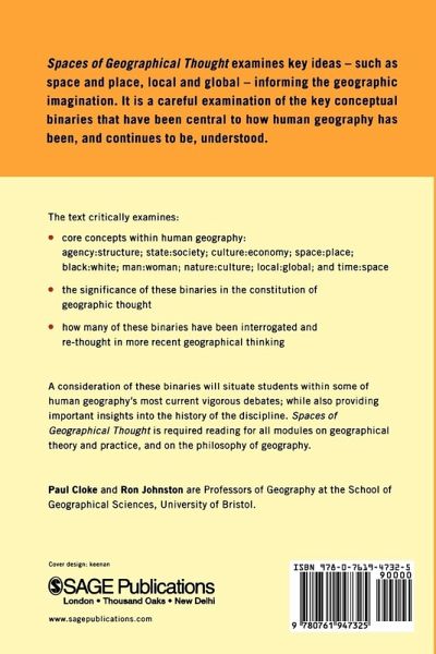 Spaces of Geographical Thought examines key ideas - like space and place - which inform the geographic imagination. The text: discusses the core conceptual vocabulary of human geography: agency: structure; state: society; culture: economy; space: place; black: white; man: woman; nature: culture; local: global; and time: space; explains the significance of these binaries in the constitution of geographic thought; and shows how many of these binaries have been interrogated and re-imagined in more recent geographical thinking.