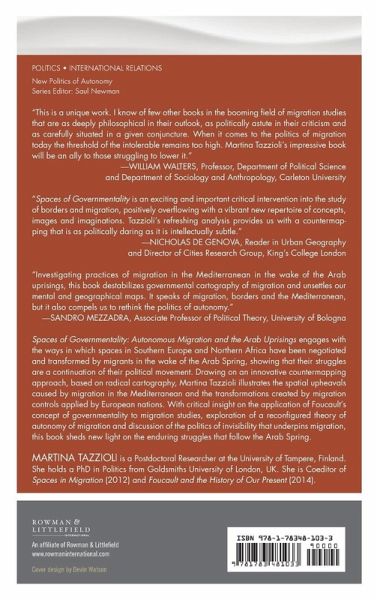Martina Tazzioli is Postdoctoral Researcher at the University of Aix-Marseille and Research Assistant at Queen Mary University of London. She is the author of Spaces of Governmentality: Autonomous Migration and the Arab Uprisings (Rowman & Littlefield, 2014), co-author of Tunisia as a Revolutionized Space of Migration (Palgrave Pivot, 2016), and co-editor of Foucault and the History of Our Present (Palgrave Macmillan, 2015). She is also a member of the editorial board of the journal materiali foucaultiani.