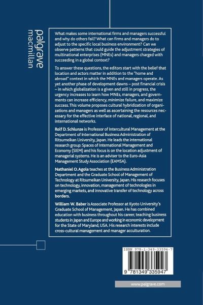 ROLF D. SCHLUNZE is Professor of Intercultural Management at the Department of International Business Administration of Ritsumeikan University, Japan. He leads the international research group: Spaces of International Management and Economy (SIEM) and his focus is on the location adjustment of managerial systems. He is an adviser for the Euro-Asia Management Study Association (EAMSA). WILL BABER is an Associate Professor at Kyoto University's Graduate School of Management, Japan. He has combined education with business throughout his career, teaching business students in Japan and Europe and working in economic development for the State of Maryland, USA. His research interests include cross-cultural management and manager acculturation. NATHANIEL O. AGOLA teaches at the Business Administration Department and the Graduate School of Management of Technology at Ritsumeikan University, Japan. His research focuses on technology, innovation, management of technologies in emerging markets, and innovative transfer of technology across borders.