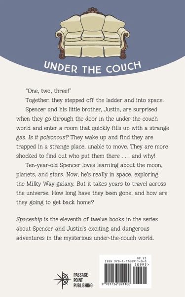 "One, two, three!" Together, the two brothers join arms and step off the ladder and into space. Spencer and his seven-year-old brother, Justin, are surprised when they go through the door in the under-the-couch world and enter a room that quickly fills up with a strange gas. Is it poisonous? They wake up and find they are trapped in a strange place, unable to move. They are more shocked to find out who put them there ... and why! Ten-year-old Spencer loves learning about the moon, planets, and stars. Now, he's really in space, exploring the Milky Way galaxy. But it takes years to travel across the universe. How long have they been gone, and how are they going to get back home? Spaceship is the eleventh of twelve books in a children's fantasy series about Spencer and Justin's exciting and dangerous adventures in the mysterious under-the-couch world. The brothers have fun and learn valuable lessons through their experiences on their adventures. In this book, the boys learn about space and other forms of life in the universe. They also learn from an extremely intelligent being about the true meaning of life.