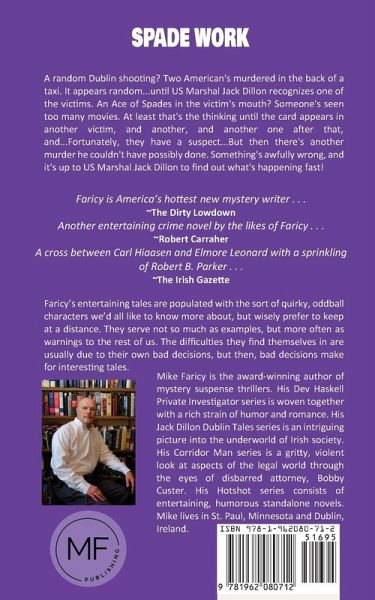 Spade Work: Jack Dillon Dublin Tale 6: Second Edition A random Dublin shooting? Two American's murdered in the back of a taxi. It appears random...until US Marshal Jack Dillon recognizes one of the victims. An Ace of Spades in the victim's mouth? Someone's seen too many movies. At least that's the thinking until the card appears in another victim, and another, and another one after that, and...Fortunately, they have a suspect...But then there's another murder he couldn't have possibly done. Something's awfully wrong, and it's up to US Marshal Jack Dillon to find out what's happening fast! Faricy is America's hottest new mystery writer . . . ~The Dirty Lowdown Another entertaining crime novel by the likes of Faricy . . . ~Robert Carraher A cross between Carl Hiaasen and Elmore Leonard with a sprinkling of Robert B. Parker . . . ~The Irish Gazette Faricy's entertaining tales are populated with the sort of quirky, oddball characters we'd all like to know more about but wisely prefer to keep at a distance. They serve not so much as examples but more often as warnings to the rest of us. The difficulties they find themselves in are usually due to their own bad decisions, but bad decisions make for interesting tales.