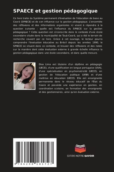 Ce livre traite du Système permanent d'évaluation de l'éducation de base au Ceará (SPAECE) et de son influence sur la gestion pédagogique. L'ensemble des réflexions et des informations organisées ici visent à répondre à la question suivante : quelle est l'influence du SPAECE sur la gestion pédagogique ? Cette question est circonscrite dans le contexte d'une école secondaire située dans la municipalité de Tauá-Ceará, qui a été le terrain de recherche couvert par ce livre. Grâce à cet ouvrage, le lecteur pourra comprendre l'évaluation éducative au Brésil depuis les années 1990, le SPAECE se situant dans ce contexte, et trouver des réflexions et des notes sur la manière dont cette évaluation externe à grande échelle influence la gestion pédagogique dans une école secondaire, et dans quelle mesure.