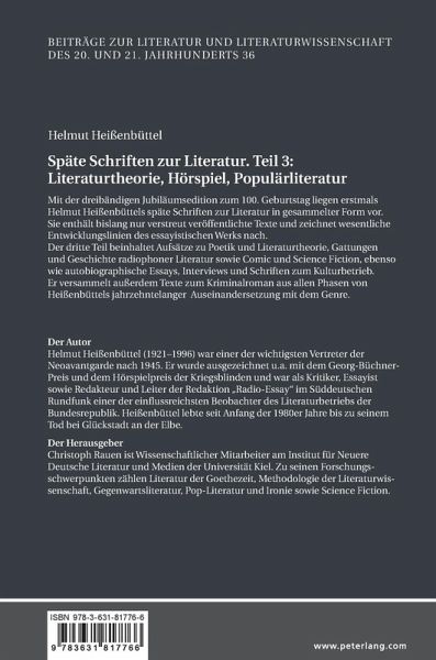 Mit der dreibändigen Jubiläumsedition zum 100. Geburtstag liegen erstmals Helmut Heißenbüttels späte Schriften zur Literatur in gesammelter Form vor. Sie enthält bislang nur verstreut veröffentlichte Texte und zeichnet wesentliche Entwicklungslinien des essayistischen Werks nach.