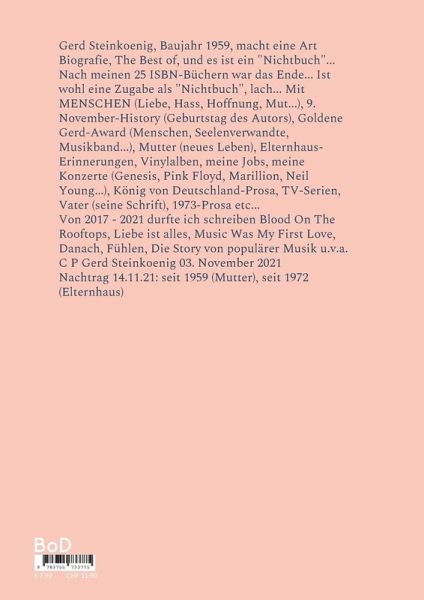 Gerd Steinkoenig, Baujahr 1959, macht eine Art Biografie, The Best of, und es ist ein "Nichtbuch"... Nach meinen 25 ISBN-Büchern war das Ende... Ist wohl eine Zugabe als "Nichtbuch", lach... Mit MENSCHEN (Liebe, Hass, Hoffnung, Mut...), 9. November-History (Geburtstag des Autors), Goldene Gerd-Award (Menschen, Seelenverwandte, Musikband...), Mutter (neues Leben), Elternhaus-Erinnerungen, Vinylalben, meine Jobs, meine Konzerte (Genesis, Pink Floyd, Marillion, Neil Young...), König von Deutschland-Prosa, TV-Serien, Vater (seine Schrift), 1973-Prosa etc...Von 2017 - 2021 durfte ich schreiben Blood On The Rooftops, Liebe ist alles, Music Was My First Love, Danach, Fühlen, Die Story von populärer Musik u.v.a.C P Gerd Steinkoenig 03. November 2021Nachtrag 14.11.21: seit 1959 (Mutter), seit 1972 (Elternhaus)