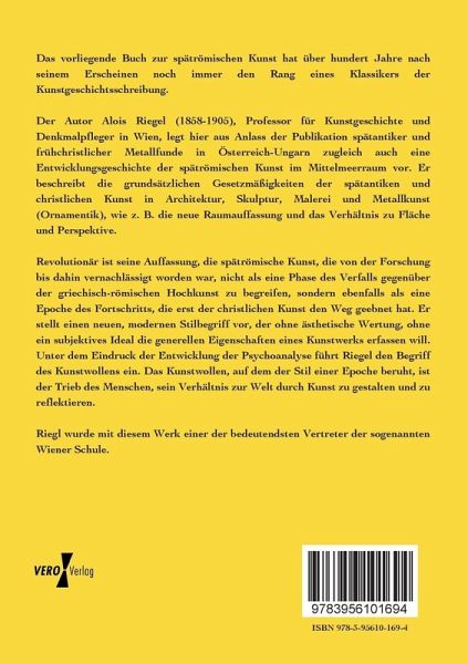 Der Autor Alois Riegel (1858-1905), Professor für Kunstgeschichte und Denkmalpfleger in Wien, legt hier aus Anlass der Publikation spätantiker und frühchristlicher Metallfunde in Österreich-Ungarn zugleich auch eine Entwicklungsgeschichte der spätrömischen Kunst im Mittelmeerraum vor. Er beschreibt die grundsätzlichen Gesetzmäßigkeiten der spätantiken und christlichen Kunst in Architektur, Skulptur, Malerei und Metallkunst (Ornamentik), wie z. B. die neue Raumauffassung und das Verhältnis zu Fläche und Perspektive.