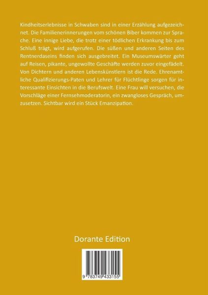 Kindheitserlebnisse in Schwaben sind in einer Erzählung aufgezeichnet. Die Familienerinnerungen vom schönen Biber kommen zur Sprache. Eine innige Liebe, die trotz einer tödlichen Erkrankung bis zum Schluß trägt, wird aufgerufen. Die süßen und anderen Seiten des Rentnerdaseins finden sich ausgebreitet. Ein Museumswärter geht auf Reisen, pikante, ungewollte Geschäfte werden zuvor eingefädelt. Von Dichtern und anderen Lebenskünstlern ist die Rede. Ehrenamtliche Qualifizierungs-Paten und Lehrer für Flüchtlinge sorgen für interessante Einsichten in die Berufswelt. Eine Frau will versuchen, die Vorschläge einer Fernsehmoderatorin, ein zwangloses Gespräch, umzusetzen. Sichtbar wird ein Stück Emanzipation.
