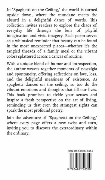 In "Spaghetti on the Ceiling," the world is turned upside down, where the mundane meets the absurd in a delightful dance of words. This collection invites readers to explore the chaos of everyday life through the lens of playful imagination and vivid imagery. Each poem serves as a whimsical reminder that beauty can be found in the most unexpected places-whether it's the tangled threads of a family meal or the vibrant colors splattered across a canvas of routine. With a unique blend of humor and introspection, the author weaves together moments of nostalgia and spontaneity, offering reflections on love, loss, and the delightful messiness of existence. As spaghetti dances on the ceiling, so too do the vibrant emotions and thoughts that fill our lives. This book promises to tickle your senses and inspire a fresh perspective on the art of living, reminding us that even the strangest sights can spark the most profound poetry. Join the adventure of "Spaghetti on the Ceiling," where every page offers a new twist and turn, inviting you to discover the extraordinary within the ordinary.