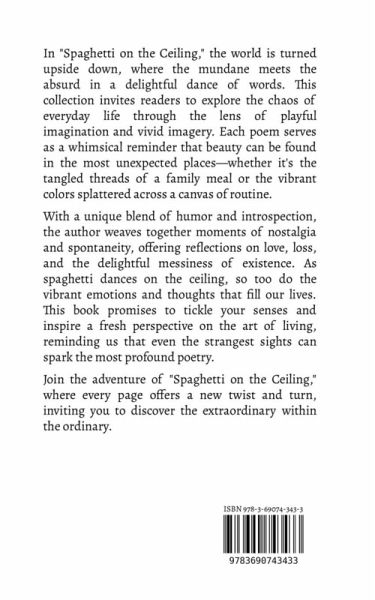 In "Spaghetti on the Ceiling," the world is turned upside down, where the mundane meets the absurd in a delightful dance of words. This collection invites readers to explore the chaos of everyday life through the lens of playful imagination and vivid imagery. Each poem serves as a whimsical reminder that beauty can be found in the most unexpected places-whether it's the tangled threads of a family meal or the vibrant colors splattered across a canvas of routine. With a unique blend of humor and introspection, the author weaves together moments of nostalgia and spontaneity, offering reflections on love, loss, and the delightful messiness of existence. As spaghetti dances on the ceiling, so too do the vibrant emotions and thoughts that fill our lives. This book promises to tickle your senses and inspire a fresh perspective on the art of living, reminding us that even the strangest sights can spark the most profound poetry. Join the adventure of "Spaghetti on the Ceiling," where every page offers a new twist and turn, inviting you to discover the extraordinary within the ordinary.
