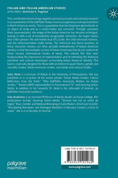 Preface, "Split Tomato Sauce" by Tommi Avicolli Mecca, writer, singer/songwriter, activist, and editor of Smash the Church, Smash the State: The Early Years of Gay Liberation.- Introduction by Sole Anatrone and Julia Heim.- "Coming Out and Leaving Home: Cultural Friction in the Italian American Kitchen" by Eilis Kierans, PhD candidate in Italian Studies at Rutgers University, USA.- "Passion and Pulp: Impossible Families" by Clarissa Clò, PhD, Professor and Chair, and Director of the Italian Studies Program, in the Department of European Studies at San Diego State University, USA.- "Queer Categorical Miscegenation: Sexuality, Race, Gender, Class, and Ethnicity in Victor Bumbalo's Niagara Falls and Questa" by John Champagne, PhD, Professor of English at Penn State Erie, the Behrend College, USA.- "I would like to be a spoiled rich white girl" by Nick Boston,PhD, associate professor of media sociology at Lehman College, USA.- "Lifestyles of the Gay and Mobster" by Julia Heim, PhD, Lecturer in Italian at University of Pennsylvania, USA.- "Queering the Guido or Guidoing the Queer? Performing Gender and Identity on Comedy Television" by Carmelo Galati, PhD, Associate Professor of Instruction and Co-Director of the Italian Studies Program at Temple University, USA.- "Time to come out, girl!": Queering Italian American Sexuality on TV Land's Younger by Aria Cabot, PhD, Director of the World Languages and Literatures Teaching and Technology Center at Southern Methodist University, USA.- Spotlights: These "spotlights" are short, autobiographical pieces that appear throughout the book, interspersed between the chapters, serving as both a break from the more scholarly work, and a look at what it means to live as a queer Italian American media-maker. The authors-whoare all involved in media in a variety of ways-reflect on how their identities as Italian Americans, and as LGBTQIA+ identified peoples influence each other and their work. Contributors:.- Rita Houston & Laura Fedele (radio personality and producer).- Annie Lanzilotto (author, playwright).- Dana Piccoli (entertainment writer and pop culture critic).- Katelynn Cusanelli (reality TV star).- Norman Korpi (reality TV star).- Mitch del Monico (director).- Julio Gambuto (director and author).
