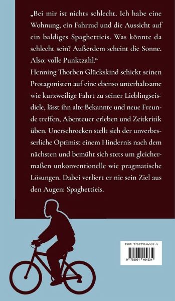 "Bei mir ist nichts schlecht. Ich habe eine Wohnung, ein Fahrrad und die Aussicht auf ein baldiges Spaghettieis. Was könnte da schlecht sein? Außerdem scheint die Sonne. Also: volle Punktzahl." Henning Thorben Glückskind schickt seinen Protagonisten auf eine ebenso unterhaltsame wie kurzweilige Fahrt zu seiner Lieblingseisdiele, lässt ihn alte Bekannte und neue Freunde treffen, Abenteuer erleben und Zeitkritik üben. Unerschrocken stellt sich der unverbesserliche Optimist einem Hindernis nach dem nächsten und bemüht sich stets um gleichermaßen unkonventionelle wie pragmatische Lösungen. Dabei verliert er nie sein Ziel aus den Augen: Spaghettieis.