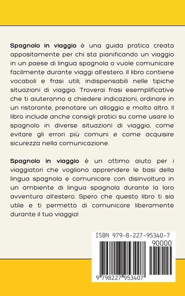 Spagnolo in viaggio è una guida pratica creata appositamente per chi sta pianificando un viaggio in un paese di lingua spagnola o vuole comunicare facilmente durante viaggi all'estero. Il libro contiene vocaboli e frasi utili, indispensabili nelle tipiche situazioni di viaggio. Troverai frasi esemplificative che ti aiuteranno a chiedere indicazioni, ordinare in un ristorante, prenotare un alloggio e molto altro. Il libro include anche consigli pratici su come usare lo spagnolo in diverse situazioni di viaggio, come evitare gli errori più comuni e come acquisire sicurezza nella comunicazione. Spagnolo in viaggio è un ottimo aiuto per i viaggiatori che vogliono apprendere le basi della lingua spagnola e comunicare con disinvoltura in un ambiente di lingua spagnola durante la loro avventura all'estero. Spero che questo libro ti sia utile e ti permetta di comunicare liberamente durante il tuo viaggio!