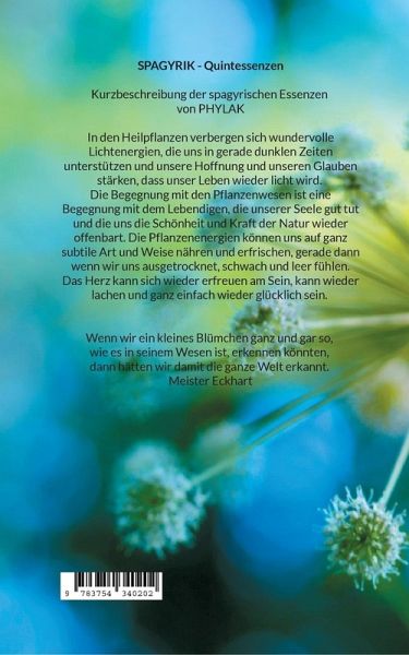 SPAGYRIK - QuintessenzenKurzbeschreibung der spagyrischen Essenzen von PHYLAKIn den Heilpflanzen verbergen sich wundervolle Lichtenergien die uns in gerade dunklen Zeiten unterstützen und unsere Hoffnung und unseren Glauben stärken, dass unser Leben wieder licht wird. Die Begegnung mit den Pflanzenwesen ist eine Begegnung mit dem Lebendigen, die unserer Seele gut tut und die uns die Schönheit und Kraft der Natur wieder offenbart. Die Pflanzenenergien können uns auf ganz subtile Art und Weise nähren und erfrischen, gerade dann wenn wir uns ausgetrocknet, schwach und leer fühlen. Das Herz kann sich wieder erfreuen am Sein, kann wieder lachen und ganz einfach wieder glücklich sein.Wenn wir ein kleines Blümchen ganz und gar so, wie es in seinem Wesen ist, erkennen könnten, dann hätten wir damit die ganze Welt erkannt. Meister Eckhart