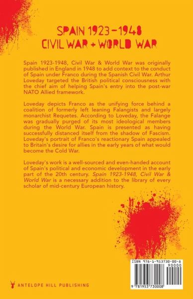 Spain 1923-1948, Civil War & World War was originally published in England, 1948 to add context to the conduct of Spain under Franco during the Spanish Civil War. Arthur Loveday targeted the British political consciousness with the chief aim of helping Spain's entry into the post-war NATO Allied framework. Loveday depicts Franco as the unifying force behind a coalition of formerly left leaning Falangists and largely monarchist Requetes. According to Loveday, the Falange was gradually purged of its most ideological members during the World War. Spain is presented as having successfully distanced itself from the shadow of Fascism. Loveday's portrait of Franco's reactionary Spain appealed to Britain's desire for allies in the early years of what would become the Cold War. Loveday's work is a well-sourced and even-handed account of Spain's political and economic development in the early part of the 20th century. Spain 1923-1948, Civil War & World War is a necessary addition to the library of every scholar of mid-century European history.