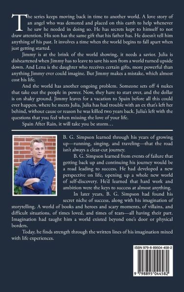 The series keeps moving back in time to another world. A love story of an angel who was demoted and placed on this earth to help whenever he saw he needed in doing so. He has secrets kept to himself to not draw attention. His son has the same gift that his father has. He doesn't tell him anything of his past. It involves a time when the world begins to fall apart when just getting started. Jimmy is at the brink of the world showing, it needs a savior. Julia is disheartened when Jimmy has to leave to save his son from a world turned upside down. And Lena is the daughter who receives certain gifts, more powerful than anything Jimmy ever could imagine. But Jimmy makes a mistake, which almost cost his life. And the world has another ongoing problem. Someone sets off 4 nukes that take out the people in power. Now, they have to start over, and the dollar is on shaky ground. Jimmy leaves for a vacation to Spain before all this could ever happen, where he meets Julia, Julia has had trouble with an ex that's left her behind, without cause or reason he was killed two years back. Julia's left with the questions that you feel when missing the love of your life. Spain After Rain, it will take you be storm...