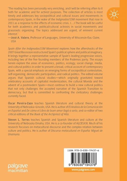 Part I. A New Cultural Politics for Spain.- 1. Introduction: A New Cultural Politics for Spain; Óscar Pereira-Zazo and Steven L. Torres.- Part II. Political Crisis.- 2. 15-M and Indignant Democracy: Legitimation Problems within Neoliberal Capitalism; Juan Carlos Monedero.- 3. 'Populism' as the Task of Constructing a People for Change; Luis Alegre Zahonero.- 4. Podemos in Spain: Limits and Possibilities for Change; Santiago Alba Rico.- Part III. Economic Failure.- 5. Speculation and Corruption in the DNA of the Spanish Economy; José Manuel Naredo.- 6. The 15-M and the Financialization of Spanish Society; Armando Fernández-Steinko.- 7. Basic Income: A Rational Proposal Guaranteeing the Material Existence of the Population; Daniel Raventós and Julie Wark.- Part IV. Environmental Crossroads.- 8. Feminism and Environmentalism in Dialogue with the 15-M and the New Political Cycle in Spain; Yayo Herrero.- 9. The Podemos Phenomenon and the Crisis of Civilization; Emilio Santiago-Muiño.- 10. Toward a Postindustrial Left in Spain: Political Parties and Social Movements Facing the Collapse of Civilization; Manuel Casal-Lodeiro.- Part V. Media Control.- 11. Media Control and Emancipation: The Public Sphere in Post-15-M Spain; Sebastiaan Faber and Bécquer Seguín.- 12. The Press is Dead... Long Live the Press; Pascual Serrano.- 13. Breaking the Walls of the Palace. The 15-M Facing the Mass Media and the Culture Industry; César Rendueles and Jorge Sola.- Part VI. Social Mobilization.- 14. From the Politicization of Life to the New Politics; Marina Garcés.- 15. Post-15-M Grassroots Interventions in and for Public Space-Resurgence in Everyday Forms of Control and Resistance; Megan Saltzman.- 16. PAH; Jordi Mir-Garcia.- Part VII. Culture in Transition.- 17. Cultura a la Contra: Toward Alternatives to the Civilizational and Ecological Crisis; Palmar Álvarez-Blanco.- 18. Reasons to Celebrate; Alberto San Juan.- 19. Ending the Culture of Fear Once and forAll: Notes on NegraBlanca and Other Forms of Post-15-M Empowerment; Luis Moreno-Caballud and Helena de Llanos.- 20. Broken Authorities; Belén Gopegui.- 21. A Specter Is Haunting the Recent Spanish Novel; David Becerra-Mayor.
