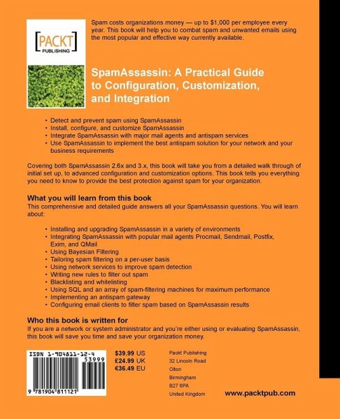 In depth guide to implementing antispam solutions using SpamAssassin .Implement the right antispam solution for your network and your business requirements .Learn how to detect and prevent spam .Optimize SpamAssassin for all major mail servers and clients .Discover how to use SpamAssassin as a service Free to use, flexible, and effective, SpamAssassin has become the most popular Open Source antispam application. Its unique combination of power and flexibility make it the right choice. This book will now help you set up and optimize SpamAssassin for your network. As a system administrator, it's down to you to implement, configure and adapt SpamAssassin to fight the Spam War. Fortunately, in SpamAssassin you chose well. Its power and flexibility make it a potent tool. However you also know that any flexible application is only as good as how it's set up and configured. This book is a comprehensive guide to the features, options and implementation strategies you need to get the most of out SpamAssassin. This comprehensive and detailed guide answers all your SpamAssassin questions. You will learn about: .Spam detection and prevention .Installing and running SpamAssassin .Using Bayesian Filtering .Configuring mail clients .Rewriting spam messages .Integrating SpamAssassin with external services .Blacklisting and whitelisting .Increasing Performance .Using SpamAssassin as a service .Using SpamAssassin with Fetchmail, postfix, sendmail, Exim, Qmail, procmail .SpamAssassin rules