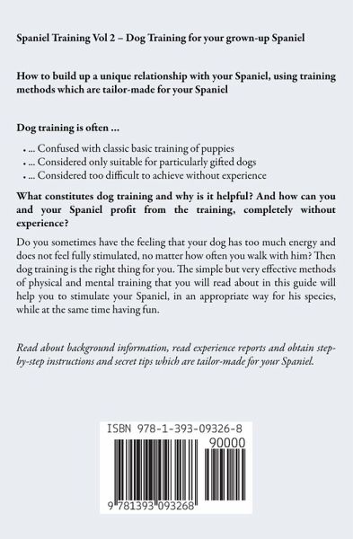 Spaniel Training Vol 2 – Dog Training for your grown-up Spaniel How to build up a unique relationship with your Spaniel, using training methods which are tailor-made for your Spaniel Dog training is often ...... Confused with classic basic training of puppies ... Considered only suitable for particularly gifted dogs ... Considered too difficult to achieve without experience What constitutes dog training and why is it helpful? And how can you and your Spaniel profit from the training, completely without experience? Do you sometimes have the feeling that your dog has too much energy and does not feel fully stimulated, no matter how often you walk with him? Then dog training is the right thing for you. The simple but very effective methods of physical and mental training that you will read about in this guide will help you to stimulate your Spaniel, in an appropriate way for his species, while at the same time having fun. This is volume two of the Spaniel training guides. Volume 1 for your Spaniel puppy is also available with the title "Spaniel Training: Dog Training for your Spaniel puppy". The author Claudia Kaiser says about her book: "I love my dog and know how important it is to keep her occupied, even after she completed her basic training. Most dogs are not satisfied with their life as a family dog and can develop destructive characteristics. If owners would take the time to spend a few minutes every day, carrying out physical and mental training with their dogs, their situations would change dramatically. Many underestimate the potential of dog training and how it can positively change life with their dogs." Read about background information, read experience reports and obtain step-by-step instructions and secret tips which are tailor-made for your Spaniel. Get your copy of this book and discover...... How to build up a unique relationship with your Spaniel ... How you can stimulate him physically and mentally in an appropriate way for his species ... And all that without previous experience in this area. In addition, you will receive an extra chapter "Fun training" free of charge!