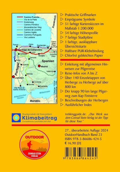 Der Camino Francés führt die Pilger über die Pyrenäen und durch die Weinberge der Rioja, in die einsamen Weiten Kastiliens und durch die grünen Berge und Täler Galiciens, bevor nach gut 800 km Santiago de Compostela mit seiner beeindruckenden Kathedrale erreicht wird. Die Vielseitigkeit der Landschaften, die Kulturschätze der Städte am Weg und die Begegnung mit Menschen aus der ganzen Welt machen die Wanderung zu einem unvergesslichen Erlebnis. Der Autor Raimund Joos, der jedes Jahr mehrere Monate auf diesem und anderen Jakobswegen unterwegs ist, beschreibt den Camino Francés in über 140 Einzeletappen, die individuell zu Tagesetappen zusammengestellt werden können. Auch interessante Nebenstrecken und der weiterführende Weg von Santiago zum Kap Finisterre werden vorgestellt. Zu jedem Etappenziel werden natürlich Übernachtungsmöglichkeiten in Herbergen angegeben, sodass Pilgerinnen und Pilger nach einem anstrengenden Tag leicht eine Unterkunft finden. Informationen zu Sehenswürdigkeiten am Weg und wichtige allgemeine Hinweise zu Themen wie "An- und Abreise", "Ausrüstung" und "Sprache" runden die Wegbeschreibung ab.