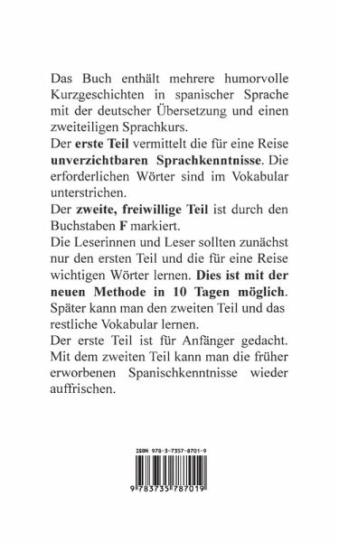 Das Buch enthält mehrere humorvolle Kurzgeschichten in spanischer / deutscher Sprache und einen zweiteiligen Sprachkurs. Der erste Teil vermittelt die für eine Reise unverzichtbaren Sprachkenntnisse. Die erforderlichen Wörter sind im Vokabular unterstrichen. Der zweite, freiwillige Teil ist durch den Buchstaben F markiert. Die Leserinnen und Leser sollten zunächst nur den ersten Teil und die für eine Reise wichtigen Wörter lernen. Dies ist mit der neuen Methode in 10 Tagen möglich. Später kann man den zweiten Teil und das restliche Vokabular lernen. Der erste Teil ist für Anfänger gedacht. Mit dem zweiten Teil kann man die früher erworbenen Spanischkenntnisse auffrischen.