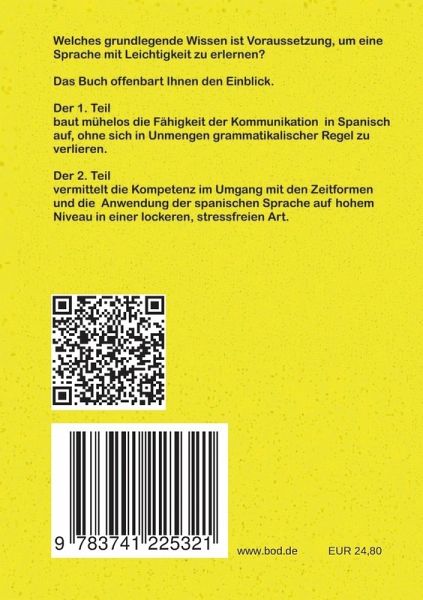 Spanisch Lernen leicht gemacht, schnell erfolgreich, kreativ. In musischer Art vermittelt "Spanisch Lernen mit Leichtigkeit" das ausschlaggebende Wissen um die Anwendung des "Castellano" und begleitet in unterschiedlichen Themenbereichen des Alltags zur Kommunikation. Dabei dient es Anfängern und Fortgeschrittenen ab 10 Jahren gleichzeitig als Lernbuch, Nachschlagewerk und Notizbuch sowie als Sprachführer und täglicher Begleiter. Es enthält das ideale Lehr- und Lernmaterial, liefert die richtige Umgangsweise damit, vermittelt Erfolgserlebnisse und motiviert durch seine Unkompliziertheit zum Lernen.