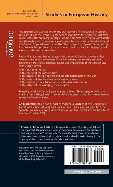 Andy Durgan provides a clear introductory overview and evaluation of the key debates and recent research on the origins, outbreak, course and implications of the Spanish Civil War, including the impact of foreign powers, the socio-political situation, the Republican failure and Nationalist success and the nature of the emerging Franco regime.
