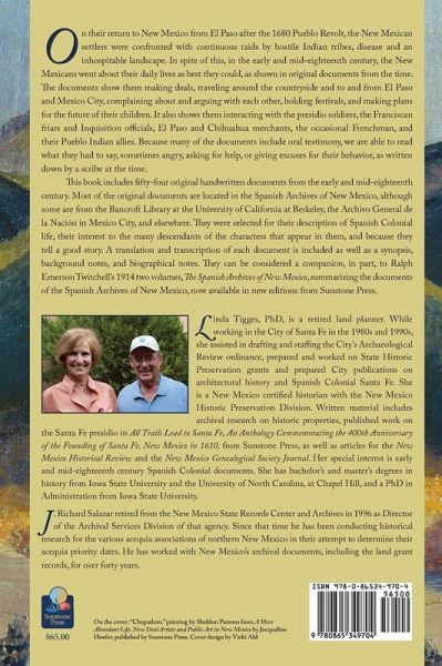On their return to New Mexico from El Paso after the 1680 Pueblo Revolt, the New Mexican settlers were confronted with continuous raids by hostile Indians tribes, disease and an inhospitable landscape. In spite of this, in the early and mid-eighteenth century, the New Mexicans went about their daily lives as best they could, as shown in original documents from the time. The documents show them making deals, traveling around the countryside and to and from El Paso and Mexico City, complaining about and arguing with each other, holding festivals, and making plans for the future of their children. It also shows them interacting with the presidio soldiers, the Franciscan friars and Inquisition officials, El Paso and Chihuahua merchants, the occasional Frenchman, and their Pueblo Indian allies. Because many of the documents include oral testimony, we are able to read what they had to say, sometimes angry, asking for help, or giving excuses for their behavior, as written down by a scribe at the time. This book includes fifty-four original handwritten documents from the early and mid-eighteenth century. Most of the original documents are located in the Spanish Archives of New Mexico, although some are from the Bancroft Library at the University of California at Berkeley, the Archivo General de la Nacion in Mexico City, and elsewhere. They were selected for their description of Spanish Colonial life, of interest to the many descendants of the characters that appear in them, and because they tell a good story. A translation and transcription of each document is included as well as a synopsis, background notes, and biographical notes. They can be considered a companion, in part, to Ralph Emerson Twitchell's 1914 two volumes, "The Spanish Archives of New Mexico," summarizing the documents of the Spanish Archives of New Mexico, now available in new editions from Sunstone Press. LINDA TIGGES, PhD, is a retired land planner. While working in the City of Santa Fe in the 1980s and 1990s, she assisted in drafting and staffing the City's Archaeological Review ordinance, prepared and worked on State Historic Preservation grants and prepared City publications on architectural history and Spanish Colonial Santa Fe. She is a New Mexico certified historian with the New Mexico Historic Preservation Division. Written material includes archival research on historic properties, published work on the Santa Fe presidio in "All Trails Lead to Santa Fe, An Anthology Commemorating the 400th Anniversary of the Founding of Santa Fe, New Mexico in 1610," from Sunstone Press, as well as articles for the "New Mexico Historical Review" and the "New Mexico Genealogical Society Journal." Her special interest is early and mid-eighteenth century Spanish Colonial documents. She has bachelor's and master's degrees in history from Iowa State University and the University of North Carolina, at Chapel Hill, and a PhD in Administration from Iowa State University. J. RICHARD SALAZAR retired from the New Mexico State Records Center and Archives in 1996 as Director of the Archival Services Division of that agency. Since that time he has been conducting historical research for the various acequia associations of northern New Mexico in their attempt to determine their acequia priority dates. He has worked with New Mexico's archival documents, including the land grant records, for over forty years.
