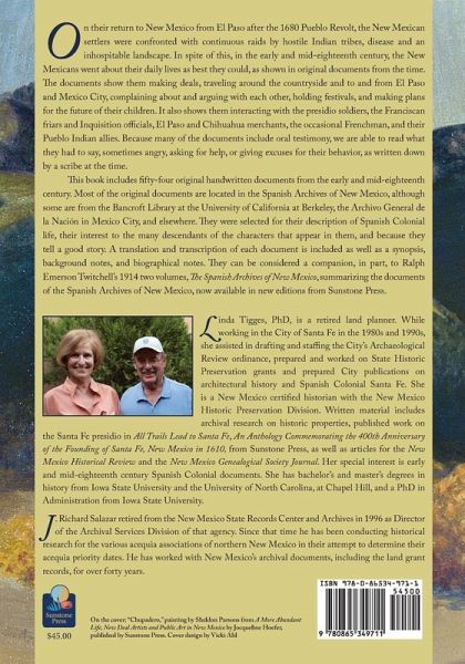 On their return to New Mexico from El Paso after the 1680 Pueblo Revolt, the New Mexican settlers were confronted with continuous raids by hostile Indians tribes, disease and an inhospitable landscape. In spite of this, in the early and mid-eighteenth century, the New Mexicans went about their daily lives as best they could, as shown in original documents from the time. The documents show them making deals, traveling around the countryside and to and from El Paso and Mexico City, complaining about and arguing with each other, holding festivals, and making plans for the future of their children. It also shows them interacting with the presidio soldiers, the Franciscan friars and Inquisition officials, El Paso and Chihuahua merchants, the occasional Frenchman, and their Pueblo Indian allies. Because many of the documents include oral testimony, we are able to read what they had to say, sometimes angry, asking for help, or giving excuses for their behavior, as written down by a scribe at the time. This book includes fifty-four original handwritten documents from the early and mid-eighteenth century. Most of the original documents are located in the Spanish Archives of New Mexico, although some are from the Bancroft Library at the University of California at Berkeley, the Archivo General de la Nacion in Mexico City, and elsewhere. They were selected for their description of Spanish Colonial life, of interest to the many descendants of the characters that appear in them, and because they tell a good story. A translation and transcription of each document is included as well as a synopsis, background notes, and biographical notes. They can be considered a companion, in part, to Ralph Emerson Twitchell's 1914 two volumes, "The Spanish Archives of New Mexico," summarizing the documents of the Spanish Archives of New Mexico, now available in new editions from Sunstone Press. LINDA TIGGES, PhD, is a retired land planner. While working in the City of Santa Fe in the 1980s and 1990s, she assisted in drafting and staffing the City's Archaeological Review ordinance, prepared and worked on State Historic Preservation grants and prepared City publications on architectural history and Spanish Colonial Santa Fe. She is a New Mexico certified historian with the New Mexico Historic Preservation Division. Written material includes archival research on historic properties, published work on the Santa Fe presidio in "All Trails Lead to Santa Fe, An Anthology Commemorating the 400th Anniversary of the Founding of Santa Fe, New Mexico in 1610," from Sunstone Press, as well as articles for the "New Mexico Historical Review" and the "New Mexico Genealogical Society Journal." Her special interest is early and mid-eighteenth century Spanish Colonial documents. She has bachelor's and master's degrees in history from Iowa State University and the University of North Carolina, at Chapel Hill, and a PhD in Administration from Iowa State University. J. RICHARD SALAZAR retired from the New Mexico State Records Center and Archives in 1996 as Director of the Archival Services Division of that agency. Since that time he has been conducting historical research for the various acequia associations of northern New Mexico in their attempt to determine their acequia priority dates. He has worked with New Mexico's archival documents, including the land grant records, for over forty years.