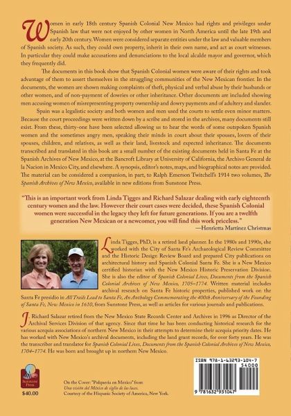 Women in early 18th century Spanish Colonial New Mexico had rights and privileges under Spanish law that were not enjoyed by other women in North America until the late 19th and early 20th century. Women were considered separate entities under the law and valuable members of Spanish society. As such, they could own property, inherit in their own name, and act as court witnesses. In particular they could make accusations and denunciations to the local alcalde mayor and governor, which they frequently did. The documents in this book show that Spanish Colonial women were aware of their rights and took advantage of them to assert themselves in the struggling communities of the New Mexican frontier. In the documents, the women are shown making complaints of theft, physical and verbal abuse by their husbands or other women, and of non-payment of dowries or other inheritance. Other documents are included showing men accusing women of misrepresenting property ownership and dowry payments and of adultery and slander. pain was a legalistic society and both women and men used the courts to settle even minor matters. Because the court proceedings were written down by a scribe and stored in the archives, many documents still exist. From these, thirty-one have been selected allowing us to hear the words of some outspoken Spanish women and the sometimes angry men, speaking their minds in court about their spouses, lovers of their spouses, children, and relatives, as well as their land, livestock and expected inheritance. The documents transcribed and translated in this book are a small number of the existing documents held in Santa Fe at the Spanish Archives of New Mexico, at the Bancroft Library at University of California, the Archivo General de la Nacion in Mexico City, and elsewhere. A synopsis, editor's notes, maps, and biographical notes are provided. The material can be considered a companion, in part, to Ralph Emerson Twitchell's 1914 two volumes, The Spanish Archives of New Mexico, available in new editions from Sunstone Press.