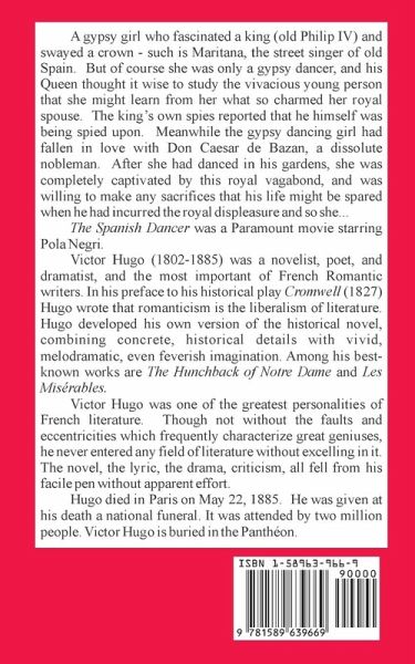 A gypsy girl who fascinated a king (old Philip IV) and swayed a crown - such is Maritana, the street singer of old Spain. But of course she was only a gypsy dancer, and his Queen thought it wise to study the vivacious young person that she might learn from her what so charmed her royal spouse. The king¿s own spies reported that he himself was being spied upon. Meanwhile the gypsy dancing girl had fallen in love with Don Caesar de Bazan, a dissolute nobleman. After she had danced in his gardens, she was completely captivated by this royal vagabond, and was willing to make any sacrifices that his life might be spared when he had incurred the royal displeasure and so she... The Spanish Dancer was a Paramount movie starring Pola Negri.Victor Hugo (1802-1885) was a novelist, poet, and dramatist, and the most important of French Romantic writers. In his preface to his historical play Cromwell (1827) Hugo wrote that romanticism is the liberalism of literature. Hugo developed his own version of the historical novel, combining concrete, historical details with vivid, melodramatic, even feverish imagination. Among his best-known works are The Hunchback of Notre Dame and Les Misérables. Victor Hugo was one of the greatest personalities of French literature. Though not without the faults and eccentricities which frequently characterize great geniuses, he never entered any field of literature without excelling in it. The novel, the lyric, the drama, criticism, all fell from his facile pen without apparent effort. Hugo died in Paris on May 22, 1885. He was given at his death a national funeral. It was attended by two million people. Victor Hugo is buried in the Panthéon.
