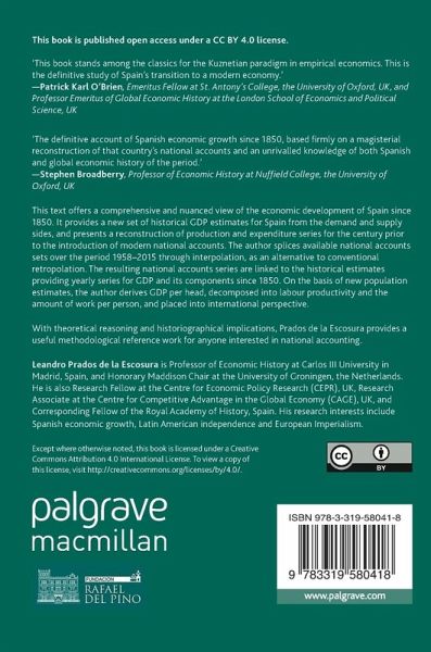 This text offers a comprehensive and nuanced view of the economic development of Spain since 1850. It provides a new set of historical GDP estimates for Spain from the demand and supply sides, and presents a reconstruction of production and expenditure series for the century prior to the introduction of modern national accounts. The author splices available national accounts sets over the period 1958-2015 through interpolation, as an alternative to conventional retropolation. The resulting national accounts series are linked to the historical estimates providing yearly series for GDP and its components since 1850. On the basis of new population estimates, the author derives GDP per head, decomposed into labour productivity and the amount of work per person, and placed into international perspective.