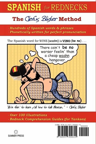 This fully illustrated, humorously entertaining book takes a fun approach to learning Spanish. Simply use (Southern American) English words to pronounce and learn Spanish words and phrases. Clefus, and the rest of your unsuspecting redneck Spanish tutors, will make you laugh and learn as parts of their everyday dialogue accidentally convert into Spanish.