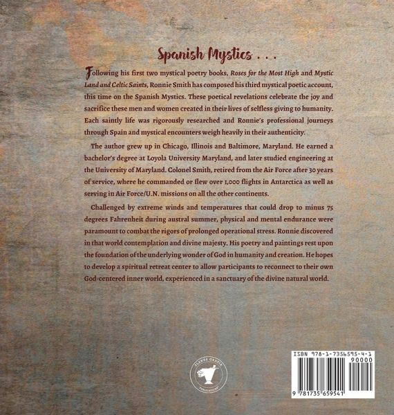Following his first two mystical poetry books, Roses for the Most High and Mystic Land and Celtic Saints, Ronnie Smith has composed his third mystical poetic account, this time on the Spanish Mystics. Hispanic contribution to the mystical path of Christianity is pronounced in the Spanish Golden Age of literature and the arts, the 16th and 17th centuries, where the preponderance of the saintly personages in this book lived out their lives of service. In deference to the rest of Europe, Catholic mysticism flourished through- out society during this timeframe because the Spanish held to the belief of Divine Intervention in everyday life. Therefore, mysticism impacted healing, politics, religion, literature, the arts, and social structures. One could say that the Spanish Golden Age of the arts and literature uniquely coincided with the Spanish Golden Age of Mysticism. poetical revelations celebrate the joy and sacrifice these men and women created in their lives of selfless giving to humanity. Each saintly life was rigorously researched and Ronnie's professional journeys through Spain and mystical encounters weigh heavily in their authenticity. The design of poems in this book intends to celebrate Spanish/Hispanic spirituality given to the world. Spanish spirituality was recognized as deeply devotional and mystically gifted throughout the Spanish Golden Age. A number of his original poems are Spanish poetical forms. He chose one of these forms, the Espinela, to resonate throughout the book on every 8th poem.
