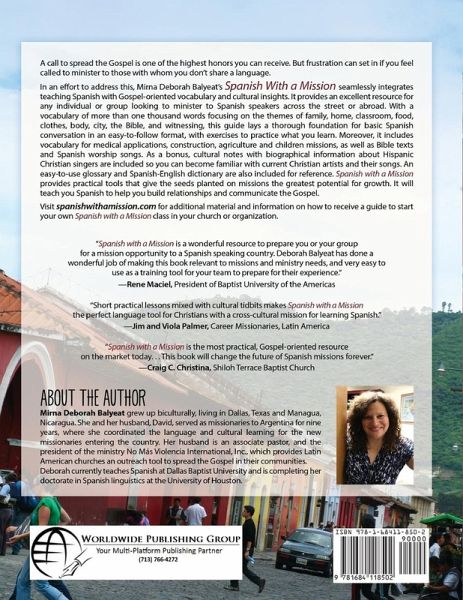 A call to spread the gospel is one of the highest honors you can receive. But frustration can set in if you feel called to minister to those with whom you don't share a language. In an effort to address this, Mirna Deborah Balyeat's Spanish With a Mission seamlessly integrates teaching Spanish with gospel-oriented vocabulary and cultural insights. It provides an excellent resource for any individual or group looking to minister to Spanish speakers across the street or abroad. With a vocabulary of more than one thousand words focusing on the themes of family, home, classroom, food, clothes, body, city, the Bible, and witnessing, this guide lays a thorough foundation for basic Spanish conversation in an easy-to-follow format, with exercises to practice what you learn. Moreover, it includes vocabulary for medical applications, construction, agriculture and children missions, as well as Bible texts and Spanish worship songs. As a bonus, cultural notes with biographical information about Hispanic Christian singers are included so you can become familiar with current Christian artists and their songs. An easy-to-use glossary and Spanish-English dictionary are also included for reference. Spanish with a Mission provides practical tools that give the seeds planted on missions the greatest potential for growth. It will teach you Spanish to help you build relationships and communicate the Gospel. Visit spanishwithamission.com for additional material and information on how to receive a guide to start your own Spanish with a Mission class in your church or organization.
