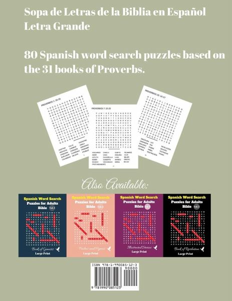 Spanish Word Search (Sopas de Letras). Bible themed word search puzzle book based on the Book of Proverbs; 80 puzzles in total. Large print can be enjoyed by seniors.