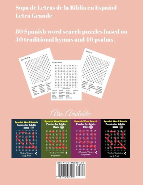 Spanish Word Search (Sopas de Letras). Bible themed word search puzzle book based on Psalms and Hymns; 80 puzzles in total. Large print can be enjoyed by seniors.