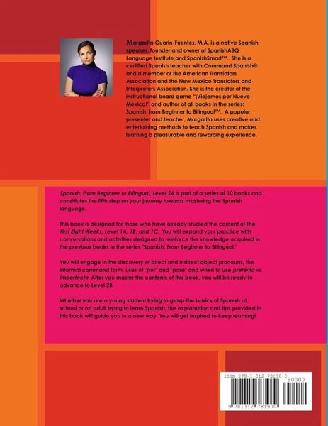 Spanish: From Beginner to Bilingual, Level 2A is part of a series of 10 books and constitutes the fifth step on your journey towards mastering the Spanish language. You will engage in the discovery of direct and indirect object pronouns, the informal command form, uses of "por" and "para" and when to use pretérito vs. imperfecto. After you master the contents of this book, you will be ready to advance to Level 2B. Whether you are a young student trying to grasp the basics of Spanish at school or an adult trying to learn Spanish, the explanation and tips provided in this book will guide you in a new way. You will get inspired to keep learning!