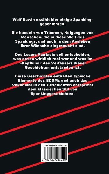 Wolf Ruwin erzählt Spanking-Geschichten von Menschen die ihre Träume und Neigungen ausleben, die von lustvollen Züchtigungen erzählen.Von Menschen, die zu ihren Neigungen stehen, sie genießen, die in die Welt des Spankings eingetaucht sind.Die Geschichten erzählen von Erfahrungen und Erlebnissen passiver Flagellantinnen. Sie enthalten typische Elemente des BDSMs, und auch das Vokabular entspricht dem klassischen Stil von Spankinggeschichten.