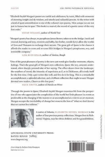 Through the poems in Spans, Elizabeth Seydel Morgan examines life from the perspective of one who appreciates the complexities of the world but finds pleasure in events as predictable as the changing of the seasons or as uncomplicated as a visit to an art museum. Morgan accepts the inevitability of change but mourns the loss of "what we don't know / that we cannot live without." By couching her wry insights in deceptively simple language, Morgan can commemorate a long-ago game of hide-and-seek in the same darkly humorous tone that she employs to recall tragedies both natural and manmade. With wit and more than a touch of melancholy, she contemplates the disappearance of the world's honeybees, the vagaries of friendships and romances, and the quiet satisfaction of garden plantings. Her poems invite the reader to examine without resentment the multifaceted world we inhabit, with all its frustrations and pleasures.