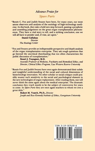The developments that have occurred in the field of organ transplantation during the 1980s and early 1990s, and the simultaneous rise and fall of the Jarvik-7 artificial heart are the subject of this vividly written and absorbing new volume. In Spare Parts, fascinating, interconnected stories of organ transplantation and the artificial heart are recounted in an interpretive framework that explores the vision of the "replaceable body." Themes of uncertainty, gift exchange, and the allocation of scarce material and non-material resources underscore a discussion that openly examines the escalating ardor about the goodness of repairing and remaking people with transplanted organs. Likewise, the stories open questions of life and death, identity, and solidarity. This important book offers insights into the symbolic and anthropomorphic meanings associated with the human body and its organs, and into the ways that medical professionals come to terms with the concomitant aspects of transferring vital body parts. Both artificial and donor organs, as well as the process of transplantation, are the subject of a thoughtful discussion which touches on the medical myths and rituals that they generate. Chronologically, Spare Parts begins where the authors' previous book, The Courage to Fail, leaves off. More than a sequel, however, this work reflects their increasingly troubled and critical reactions to the expansion of organ replacement. Likely to be controversial, this book is must reading for bioethicists, medical sociologists and anthropologists, health-care lawyers, planners and administrators, nurses and physicians, medical journalists and science writers, and concerned lay readers.