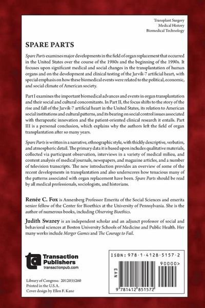 Spare Parts examines major developments in the field of organ replacement that occurred in the United States over the course of the 1980s and the beginning of the 1990s. It focuses upon significant medical and social changes in the transplantation of human organs and on the development and clinical testing of the Jarvik-7 artificial heart, with special emphasis on how these biomedical events were related to the political, economic, and social climate of American society. Part I examines the important biomedical advances and events in organ transplantation and their social and cultural concomitants. In Part II, the focus shifts to the story of the rise and fall of the Jarvik-7 artificial heart in the United States, its relation to American social institutions and cultural patterns, and its bearing on social control issues associated with therapeutic innovation and the patient-oriented clinical research it entails. Part III is a personal conclusion, which explains why the authors left the field of organ transplantation after so many years. Spare Parts is written in a narrative, ethnographic style, with thickly descriptive, verbatim, and atmospheric detail. The primary data it is based upon includes qualitative materials, collected via participant observation, interviews in a variety of medical milieu, and content analysis of medical journals, newspapers, and magazine articles, and a number of television transcripts. The new introduction provides an overview of some of the recent developments in transplantation and also underscores how tenacious many of the patterns associated with organ replacement have been. Spare Parts should be read by all medical professionals, sociologists, and historians.