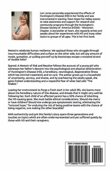 Memoirs celebrate human resilience. We applaud those who struggle through insurmountable difficulties and surface on the other side, but will any amount of moxie, gumption, or pulling yourself up by bootstraps escape a mutated strand of double helix? Spared: A Memoir of Risk and Resolve follows the account of a young girl who witnesses her father's descent into the psychological and physical deterioration of Huntington's Disease (HD), a hereditary, neurological, degenerative illness which has minimal treatments and no cure. The author grows up in a household of uncertainty, secrecy, and shame, and by overhearing the adults speak, she gains limited understanding and a respectful fear of what Dad calls "The Shakes." Leaving her environment to forge a fresh start in her adult life, she learns more about the hereditary nature of this disease, and dreads that it might very well be following her. Each child of an affected parent has a 50% chance of inheriting the HD-causing gene. She must battle ethical considerations. Should she marry or have children? Should she undergo pre-symptomatic testing, eliminating the "tortured hope," for enduring the risk of being positive teams with the chance of being negative, one making the other bearable? As her grandmother, great-aunts and other family members succumb to HD, she assumes the role of guardian for her father. He cycles from one adult care home to another, while she advocates for his needs and his dignity. Through an encounter with the greater HD community she is able to give back while experiencing the support of a shared struggle. With authenticity and grit this family's story spans three generations and touches on topics which are often underrepresented and yet suffered quietly by those with HD and their caregivers. Readers learn how delayed diagnosis and concealment can adversely affect a family, bringing isolation and contributing to poverty. The author doesn't hold back, covering difficult and downplayed aspects of what has been called the cruelest and most heartbreaking illness, with symptoms described as having ALS, Parkinson's, and Alzheimer's simultaneously. She discusses living at-risk, ethical considerations of pre-symptomatic testing and procreation, the impact of religious faith, survivors' guilt, caregiving, guardianship, and organ donation. With ample scientific facts and genetic information, Spared: A Memoir of Risk and Resolve is a resource guide that reads like a story, and shines as recommended reading for institutions of higher education offering courses on mental wellness, human services, and sociology. Families affected by HD and caregiving agencies alike will find a book that speaks difficult truth and yet brings hope, with information on navigating the healthcare system, raising awareness, and increasing community support. Readers universally relate to their own life experiences with family members declining from an illness, with the added twist of the hereditary element, as HD caregivers are often also at-risk. The reader will race through these pages, release a held breath, and then page back to take in parts again, as the author describes with precision the debilitating progression of HD and the humanity that prevails.
