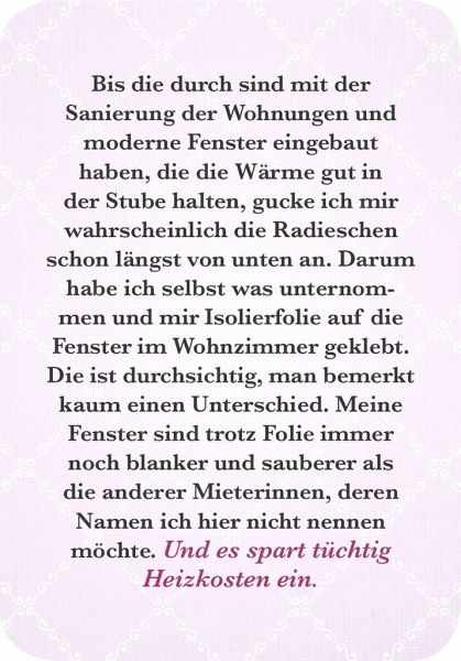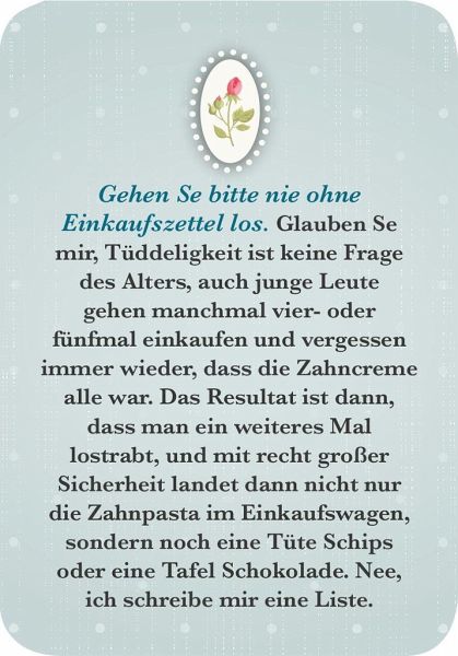 Die Kartenbox von Renate Bergmann ist eine lohnende Investition: alltagstaugliche Tipps, auf humorvolle Art auf den Punkt gebraucht, die auf Dauer einen Unterschied machen können. Ein wunderbares Geschenk für alle, die die Renate-Bergmann-Reihe lieben oder ganz neu kennenlernen möchten!