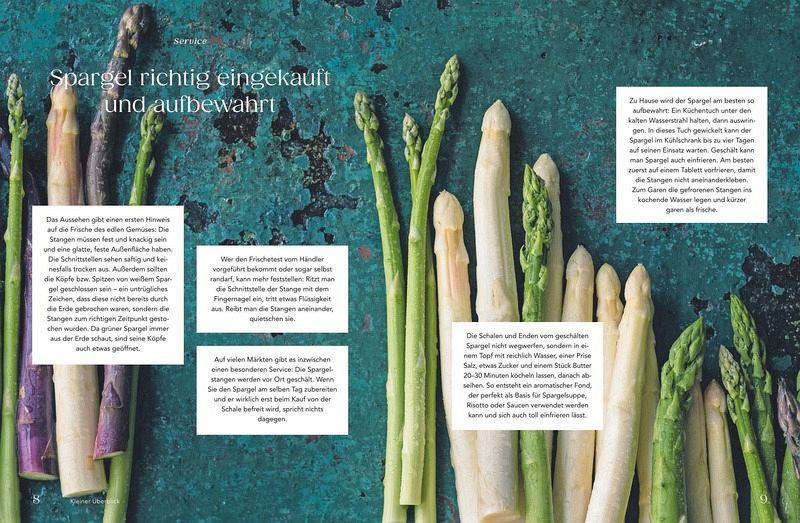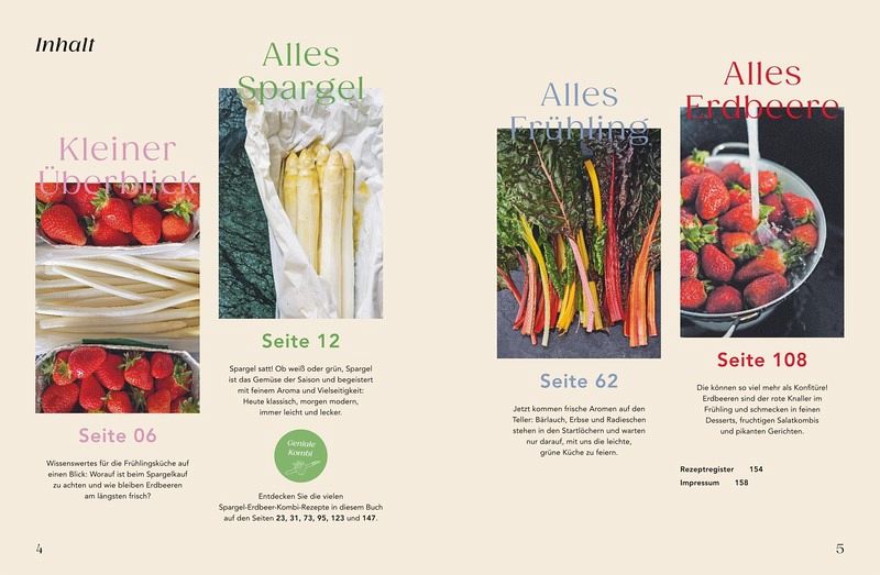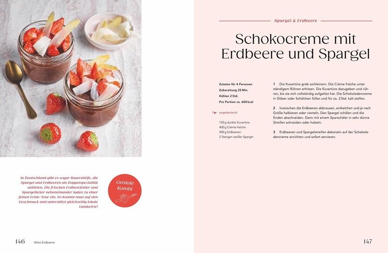 Etwas irritiert war ich aber durch die „Zwischenkapitel“. Da wird z.B. erklärt, warum Spargel und Erdbeeren auch super in Kombination funktionieren. Und direkt danach kommen dann wieder reine Spargelrezepte. Diese Zwischennotizen hätten also etwas geschickter platziert werden können. Zumal es letztlich kaum Rezepte gibt, in denen sowohl Spargel als auch Erdbeeren zusammen auf den Teller kommen. Gibt es zwar, aber wenn schon immer wieder erwähnt wird, wie gut die Kombination von beidem ist, dann hätte ich mir dazu einfach noch ein paar Rezepte mehr gewünscht.