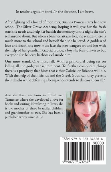 In tenebris ego sum forti... In the darkness, I am brave. After fighting off a hoard of monsters, Brianna Powers starts her new school, The Silver Grove Academy, hoping it will give her the fresh start she needs and help her banish the memory of the night she can't tell anyone about. But when a banshee attacks her, she realizes there is much more to the school and herself than she believed. A goddess of love and death, she now must face the new dangers around her with the help of her guardian, Gabriel Isolde, a boy she feels drawn to but everyone else believes harbors evil inside him. One must stand...One must fall. With a primordial being set on killing all the gods, war is imminent. To further complicate things there is a prophecy that hints that either Gabriel or Brianna will die. With the help of their friends and the Greek Gods, can they prevent their deaths while defeating a being who intends to destroy them all?