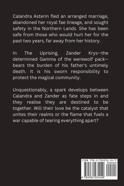 Calandra Asterin fled an arranged marriage, abandoned her royal fae lineage, and sought safety in the Northern Lands. She has been safe from those who would hurt her for the past two years, far away from her history. In The Uprising, Zander Krys-the determined Gamma of the werewolf pack-bears the burden of his father's untimely death. It is his sworn responsibility to protect the magical community, and he will do everything it takes to make sure they are secure in this refuge. Unquestionably, a spark develops between Calandra and Zander as fate steps in and they realise they are destined to be together. Attracted to each other inexorably, they have to negotiate the turbulent waters of fate and love. Will their love be the catalyst that unites their realms or the flame that fuels a war capable of tearing everything apart?