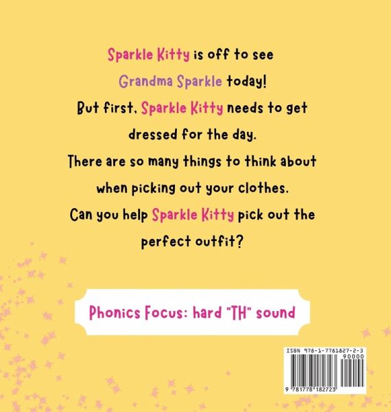 Sparkle Kitty vs. the Clothes teaches children how to choose the best clothes for the day, with interactive pages and whimsical illustrations. For children learning to read, this story has a phonics focus of the hard "TH" sound. Sparkle Kitty is off to see Grandma Sparkle today! But first, Sparkle Kitty needs to get dressed for the day. There are so many things to think about when picking out your clothes. Can you help Sparkle Kitty pick out the perfect outfit? Recommended Age: 1-5 Word Count: 343 words Lexile Level: 580 Phonics Focus: hard "TH" sound