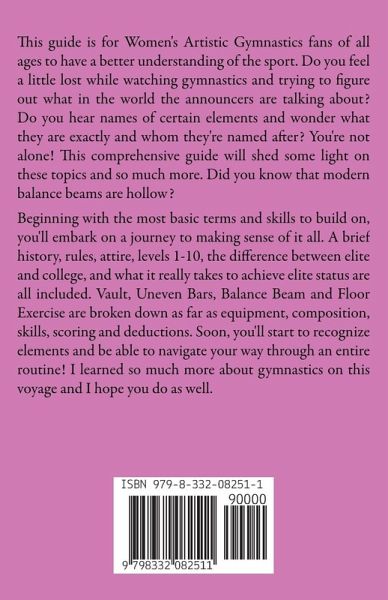 This guide is for Women's Artistic Gymnastics fans of all ages to have a better understanding of the sport. Do you feel a little lost while watching gymnastics and trying to figure out what in the world the announcers are talking about? Do you hear names of certain elements and wonder what they are exactly and whom they're named after? You're not alone! This comprehensive guide will shed some light on these topics and so much more. Did you know that modern balance beams are hollow? Beginning with the most basic terms and skills to build on, you'll embark on a journey to making sense of it all. A brief history, rules, attire, levels 1-10, the difference between elite and college, and what it really takes to achieve elite status are all included. Vault, Uneven Bars, Balance Beam and Floor Exercise are broken down as far as equipment, composition, skills, scoring and deductions. Soon, you'll start to recognize elements and be able to navigate your way through an entire routine! I learned so much more about gymnastics on this voyage and I hope you do as well.